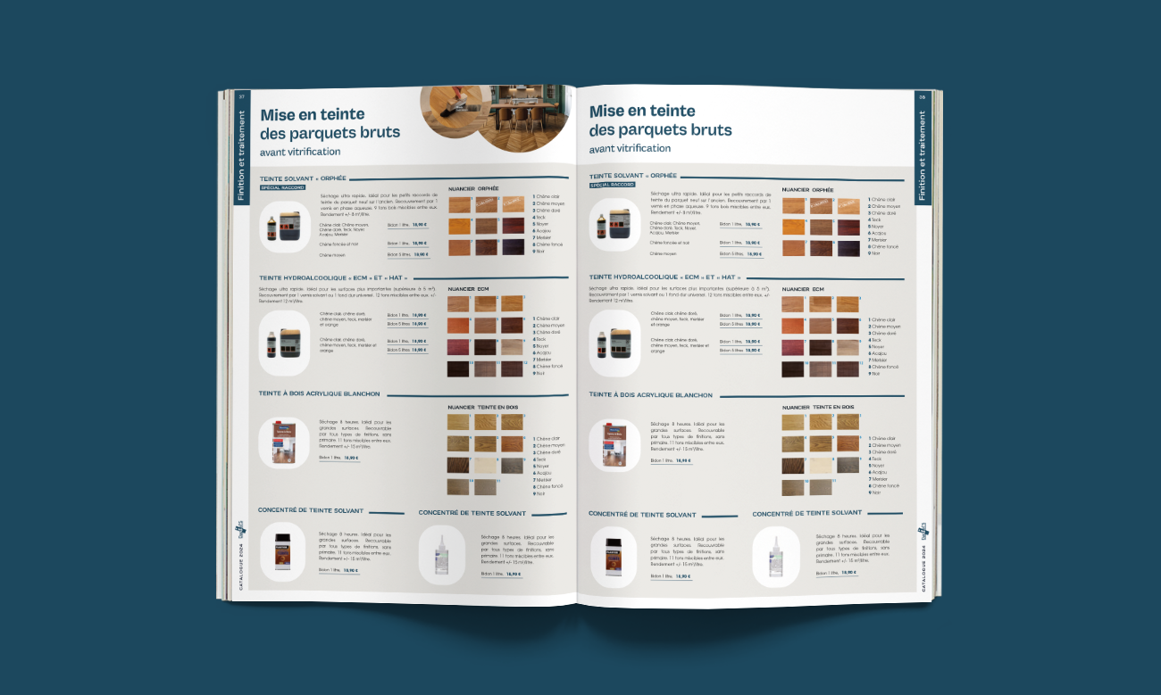 Proposition de design éditorial pour un catalogue produits destiné à un spécialiste du parquet. Le travail porte sur la mise en page de pages produits et la conception des pages de garde, avec une attention particulière portée à la lisibilité, à la hiérarchie de l’information et à la valorisation des matériaux. Ce projet met en avant une approche graphique claire, structurée et élégante, pensée pour accompagner la présentation de gammes produits dans un univers technique et qualitatif.