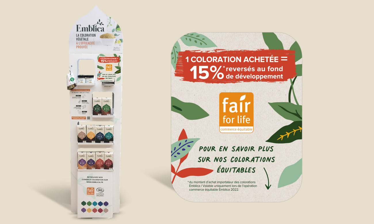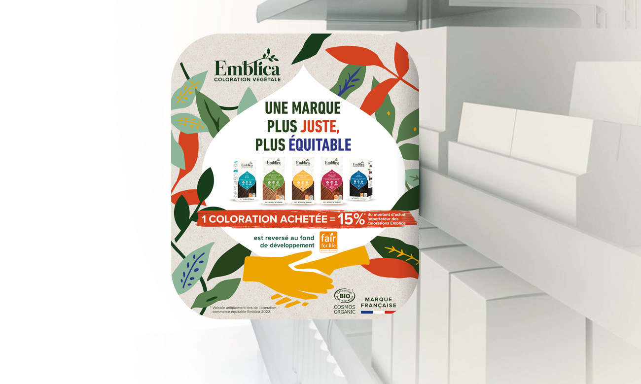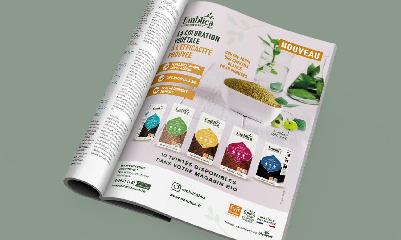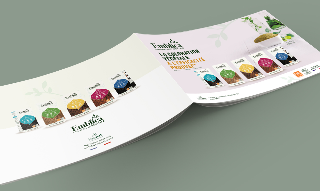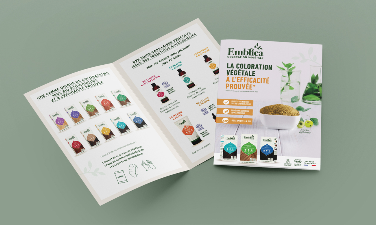 Conception et réalisation de supports print, presse, merchandising et digitaux pour Emblica, marque de colorations végétales et soins capillaires 100% naturels, bio et issus du commerce équitable, à base de plantes ayurvédiques. Les supports comprennent brochures consommateurs, outils d’aide à la vente, cahiers de formation, annonces presse B to B et B to C, stop-rayons, présentoirs, bannières web et signatures digitales. Un travail de design éditorial et communication visuelle pensé pour accompagner le lancement de la marque et valoriser son engagement éthique et responsable, ainsi que son univers naturel et authentique.