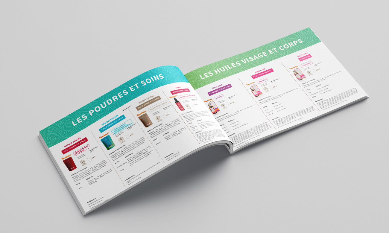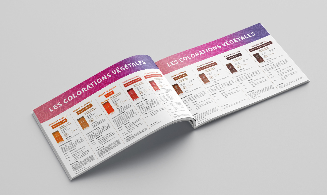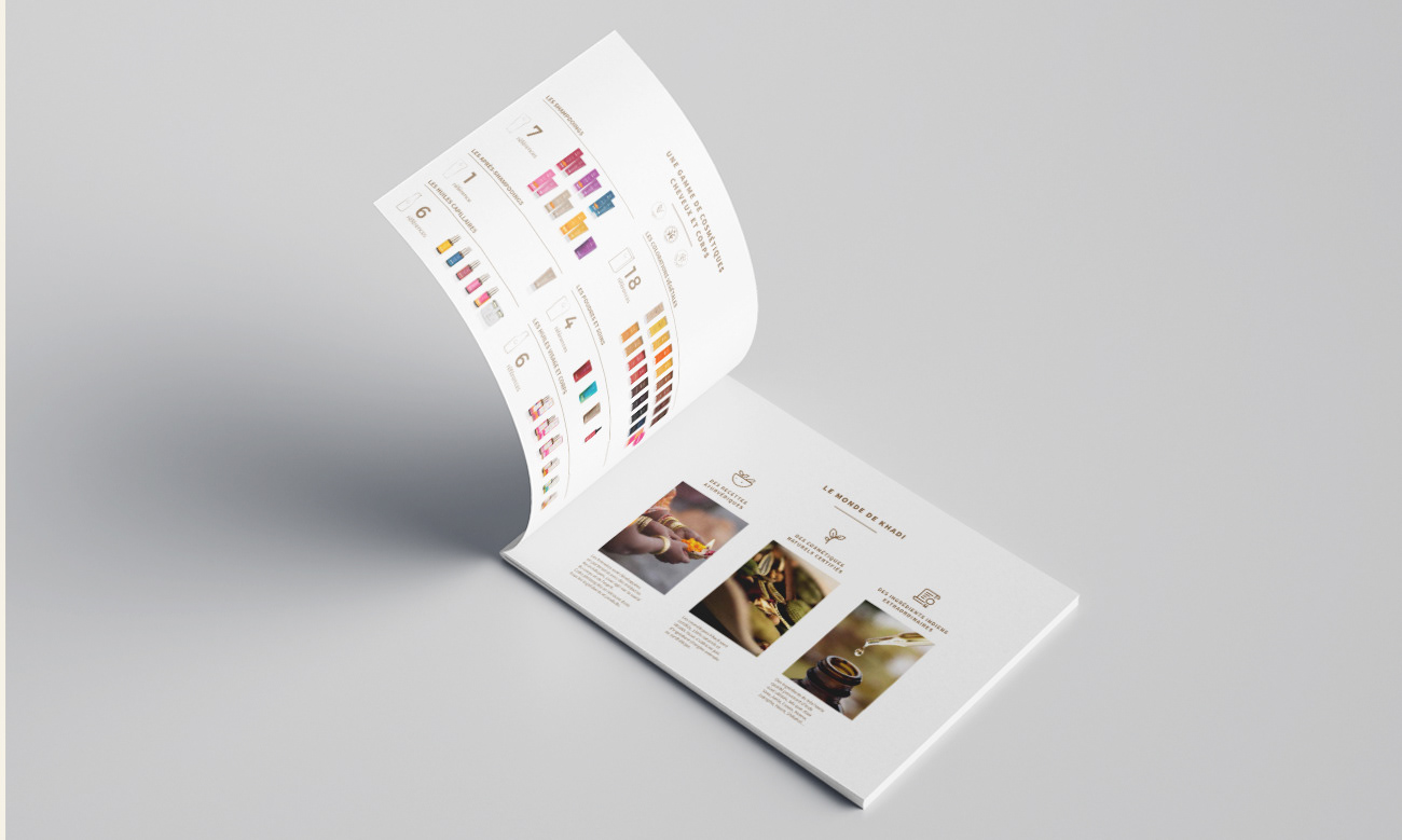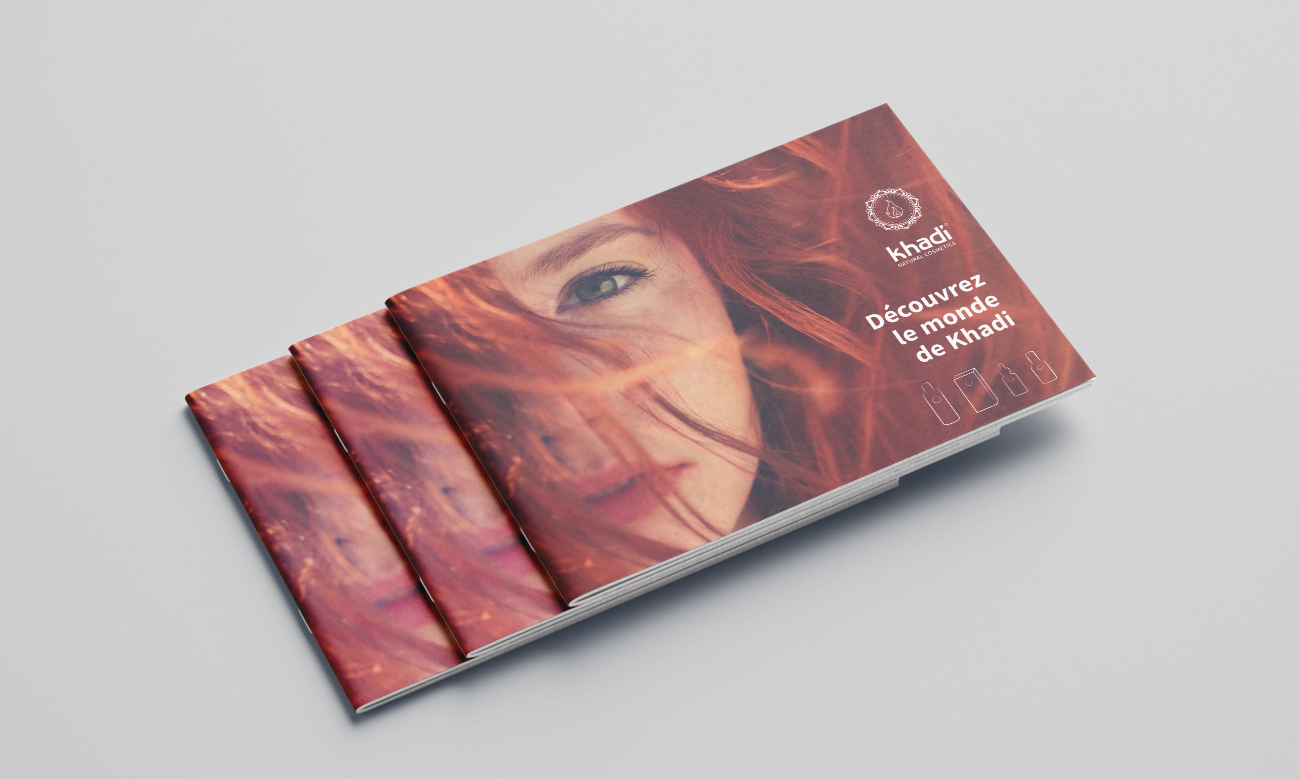 Conception et mise en page d’un catalogue produits et d’un leaflet pour Khadi, marque de cosmétiques et colorations 100% naturels et vegan. Les supports mettent en valeur l’univers Ayurvédique de la marque, ses soins capillaires riches en principes actifs, et l’ensemble de sa gamme certifiée naturelle. Un travail de design éditorial et de communication print pensé pour refléter la qualité, la tolérance cutanée et l’identité authentique de la marque.