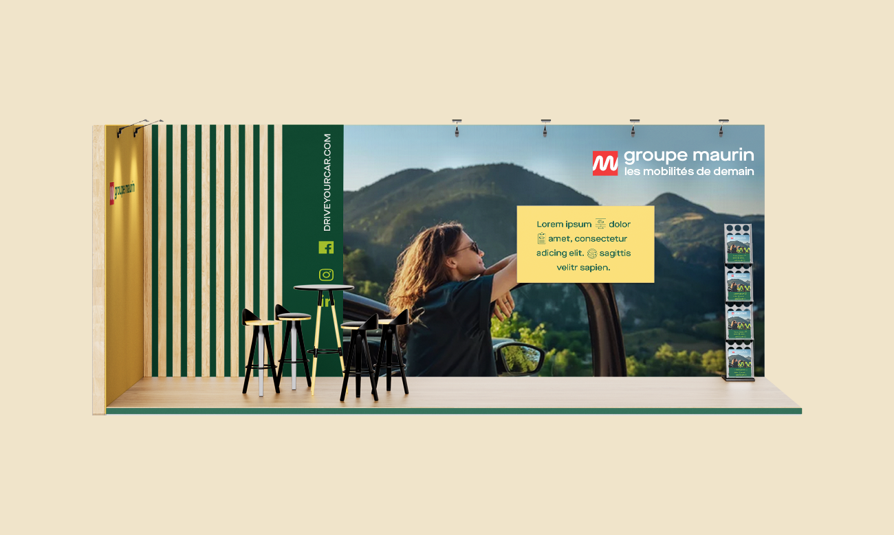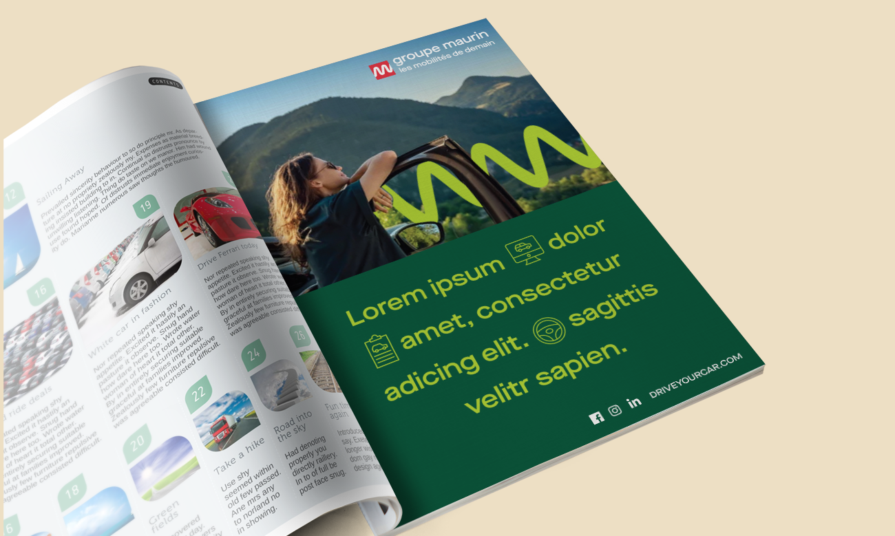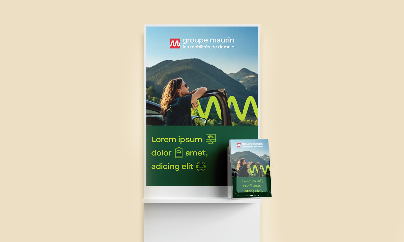 Conception de la nouvelle identité visuelle du Groupe Maurin, dans le cadre d’un appel d’offres via agence. Cet axe graphique s’inspire du mouvement circulaire intégré dans la lettre G du logo, symbolisant le dynamisme et le mouvement continu propres au secteur automobile. Le concept a été décliné sur l’ensemble des supports de communication print et digitaux : logo, papeterie, réseaux sociaux, key visual, annonces presse et outils de communication, pour garantir une cohérence visuelle forte et un branding impactant.