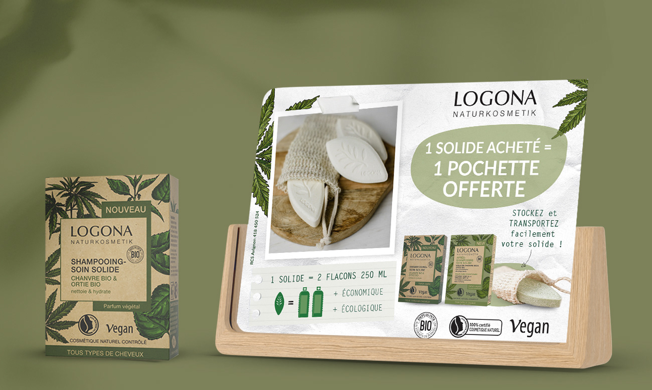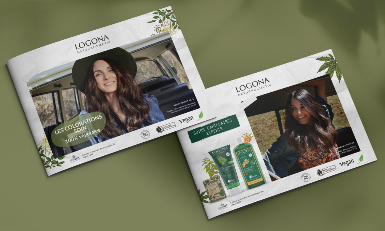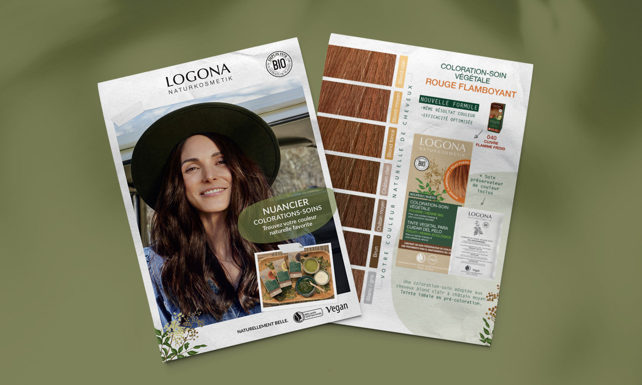 Logona est une marque pionnière de la cosmétique naturelle, fondée en 1978 en Allemagne, proposant une large gamme de soins certifiés naturels : soins capillaires, colorations végétales, cosmétiques, hygiène bucco-dentaire, produits pour bébés et enfants. J’ai accompagné la marque sur la création et la déclinaison de supports de communication print, presse, merchandising et digitaux, à destination des réseaux B to B et B to C, dans le respect de son identité et de ses engagements. Supports réalisés : - Print / Édition – B to C Brochures, leaflets, nuanciers - Print / Édition – B to B Argumentaires de vente, outils d’aide à la vente - Presse Annonces presse B to B et B to C - Merchandising Stop-rayon, portiques anti-vol, présentoirs, comptoirs - Digital Bannières web