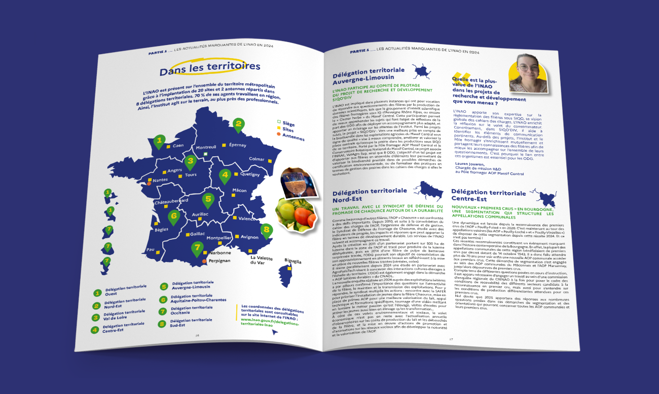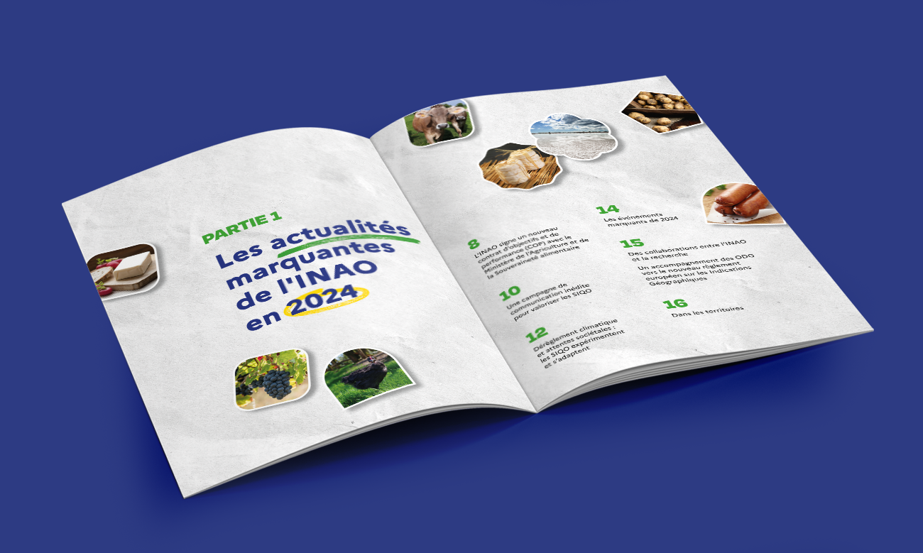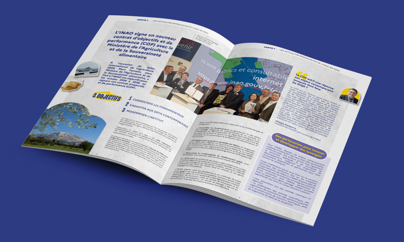 Conception graphique et mise en page du rapport d’activité de l’INAO, réalisée dans le respect de la charte graphique de l’État et en cohérence avec la campagne nationale « Il y a des signes qui ne trompent pas » (agence Mediapilote). Un document institutionnel mettant en lumière une année d’actions en faveur de la valorisation des signes officiels de qualité et d’origine (AOP, IGP, STG, Label Rouge, Agriculture Biologique). Consulter le document : https://lnkd.in/e2dMPFJB
